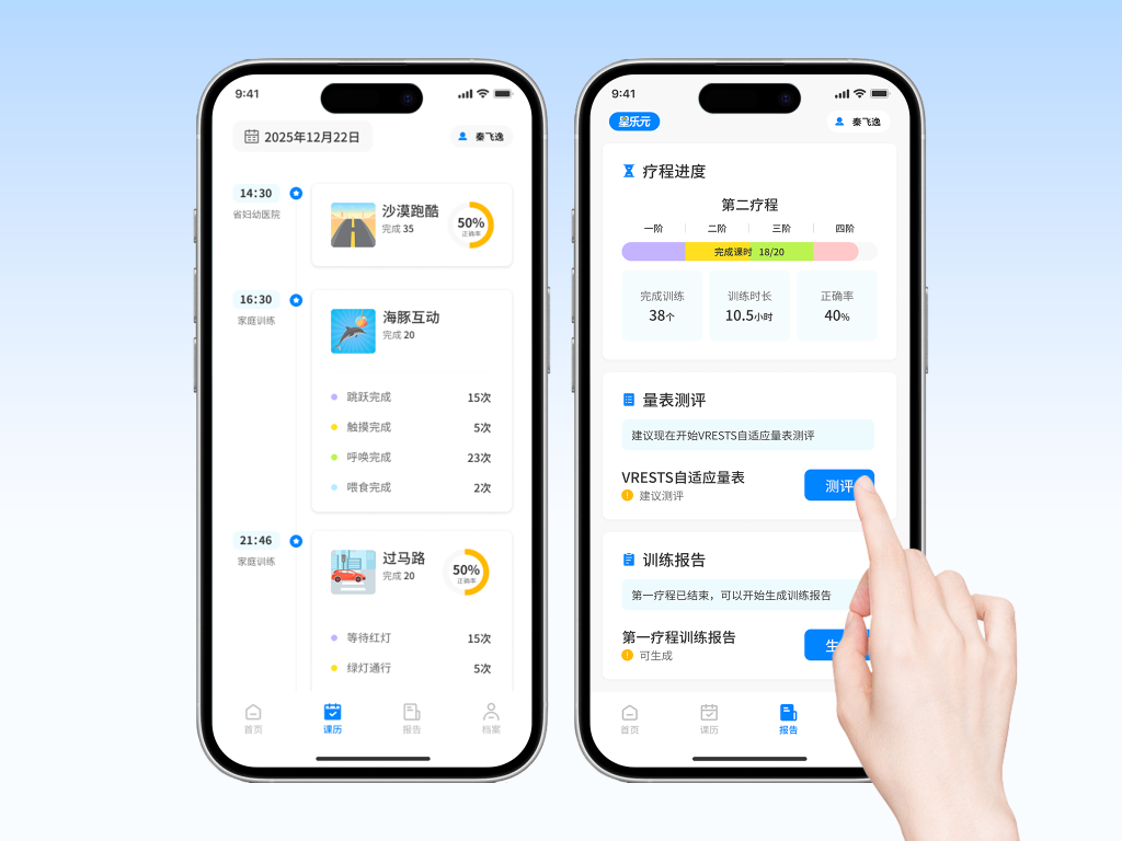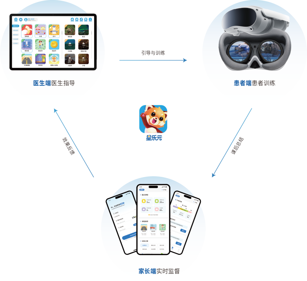 VR自然环境模拟训练软件(星乐元)——开启孩子康复的新纪元!我们是一款专为自闭症谱系障碍(ASD)儿童设计的VR康复训练软件。团队依托医学专家与行为干预领域的丰富经验,结合前沿的虚拟现实技术,致力于为孩子们提供沉浸式、个性化的治疗方案。 项目背景 社会现状 孤独症谱系障碍(autism spectrum disorder, ASD)简称孤独症,是一种神经发育性障碍,核心症状为沟通和社交互动存在缺陷、行为重复刻板以及兴趣狭窄。根据美国疾病预防控制中心2023年研究结果,8岁儿童中ASD患病率达2.76%[1]。在中国,6~12岁儿童的ASD患病率约为0.7%[2]。流行病学研究表明,过去20年来全球范围内ASD的患病率呈现持续上升的趋势,全球患病率约为1%。目前针对ASD核心症状尚无有效药物治疗,且ASD患者多数存在预后不佳,成年后不具备独立生活、学习和工作的能力,给家庭和社会带来了沉重负担。 美国8岁儿童ASD患病率 0 % 中国6~12岁儿童ASD患病率 0 % 全球ASD患病率 0 % 产品原理 沉浸式干预 VR自然环境模拟训练软件基于应用行为分析疗法(ABA)、关键反应训练(PRT)、语言行为里程碑评估及安置计划(VB-MAPP)、早期介入丹佛模式(ESDM)等理论,结合计算机多媒体、眼动追踪、实时流式传输、手势识别、三维仿真技术等高新手段,呈现丰富的三维视觉效果,使用户有身临其境的体验。本软件可以根据医生训练内容需要,模拟生成多种VR场景或MR场景、提供多种不同的训练内容,使患者增强沉浸感、锻炼患者适应新环境的能力,增加了训练过程的趣味性、极大节约了使用新训练环境和内容的成本。同时,模拟生成的场景可以根据实际训练的需要随时切换或关闭,相对实景训练也增强了训练过程的安全和稳定性。VR自然环境模拟训练软件能够有效减轻治疗师的工作负担,并辅助其对自闭症谱系障碍(ASD)患者进行系统化干预。项目训练针对 ASD 患者的核心症状设计,包括眼神接触、情绪识别、语言理解、社交互动、肢体感知、认知及社会规范等领域。同时,充分考虑患者的个体差异性,通过阶梯式难度设计和多样的训练形式,根据预评估结果,为患者定制个性化的训练方案。 产品介绍 VR自然环境模拟训练软件 通过数字化、游戏化的方式对患者进行认功能训练 。由顶尖医疗专家团队主导,基于应用行为分析疗法(ABA)、语言行为里程碑评估及安置计划(VB-MAPP)等干预方式,利用虚拟现实(VR)技术打造,让患者以第一人称在虚拟世界中沉浸体验不同的情景,参与多种形式的训练,提升认知、社交等能力,从而更好地适应社会,帮助ASD患者获得更加全面的康复效果。 生活化技能 通过拟真场景,弥补传统训练难以覆盖的生活技能。 趣味性设计 通过趣味化和寓教于乐的方式,提升训练和学习效果。 沉浸式体验 通过在沉浸式拟真环境中训练,帮助用户更好地与生活接轨。 多元化内容 涵盖多样化的训练形式与内容设计,拓展传统训练。 社会化训练 提供拟真的社交情境,满足社会化技能训练的实际需求。 权威性保障 训练内容由专家指导设计,严格遵循医学原则。 五维一体能力发展训练 行业首创能力成长体系 一套训练系统 + 一个核心理论 + 多样交互训练 + 五大成长维度 助力孤独症儿童实现个体化能力突破,让成长看得见 适用人群 患有神经发育障碍的3~12岁儿童 使用环境 医院、机构、特殊学校等 医院 学校 机构 使用方式 患者端(使用VR头显)+医生端(使用平板) 四个步骤轻松开启VR训练之旅!患者通过佩戴VR头显沉浸式体验课程,而医生则使用平板通过观察视窗(观察者模式),随时通过第三人称及第一人称视角指导整个课程的进度。 1.设备配对 在保证同一局域网下,先打开VR头显再打开平板,通过平板上的弹窗提示,将两个设备进行连接 2.课程体验 患者通过佩戴VR头显开始沉浸式体验课程 3.实时观看 VR患者端课程画面实时同步模拟到医生的平板医生端 4.提供指导 医生通过平板医生端上同步模拟的画面来指导训练与学习体验,全程提供指导与鼓励 5.查看进展 可在家长端查看患者的课程完成情况和进度,并生成报告 技术优势 VR与MR技术 VR 虚拟现实(Virtual Reality, VR)技术 用头显等设备进入沉浸式虚拟场景,已广泛应用于医学教育、康复训练和心理治疗,为患者提供安全可控的训练环境。 MR 混合现实(Mixed Reality,MR)技术 融合VR和AR,把虚拟对象叠加到现实中,能与真实环境互动,带来更自然、更沉浸的体验。 产品优势 专业量表评估、高拟真环境、丰富训练场景、训练报告分析 专业量表评估 训练前使用专业量表和生理数据评估,全面了解患者具体情况,为方案制定提供科学依据。基于评估结果,智能推荐个性化训练方案,确保干预有效性。 高拟真环境 基于unity3D引擎制作的逼真场景、全真模拟光学阴影,提供沉浸式视听体验,让患者产生更多自发行为、有效避免外界干扰。多样丰富场景和多通道信息输入,激发患者参与训练的兴趣和动机、改善患者的康复训练依从性。 丰富训练场景 包含多种针对孤独症症状的专项训练内容,根据患者实际情况定制化训练内容和方案。趣味性训练设计和互动元素,激发患者积极性、增强训练的持续性和有效性。 训练报告分析 实时监测训练进程、记录训练数据且数据丰富多样,包含动作、眼动等多维度精密数据信息。报告分析,根据训练数据,统计并归纳训练结果的变化曲线和图表基于认知评估结果